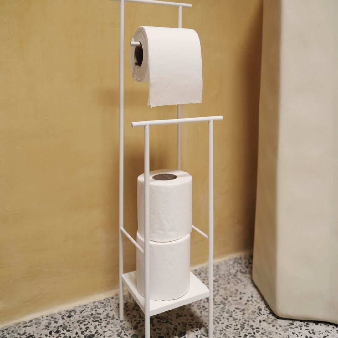 O suporte de papel higiénico Dora foi desenhado para oferecer simplicidade, funcionalidade e durabilidade num único objeto. Com estrutura metálica em aço pintado a pó resistente à ferrugem, é perfeito para ambientes húmidos como casas de banho. A sua forma leve e compacta integra um suporte para rolo em uso e uma prateleira inferior onde pode guardar rolos extra ou outros objetos essenciais.