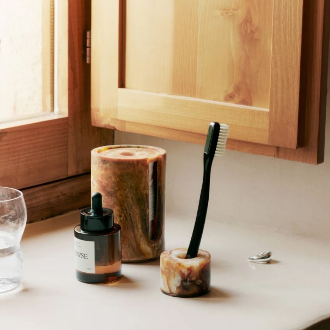 - No lavatório ou bancada da casa de banho para colocar a sua escova de dentes num local organizado e com estilo.