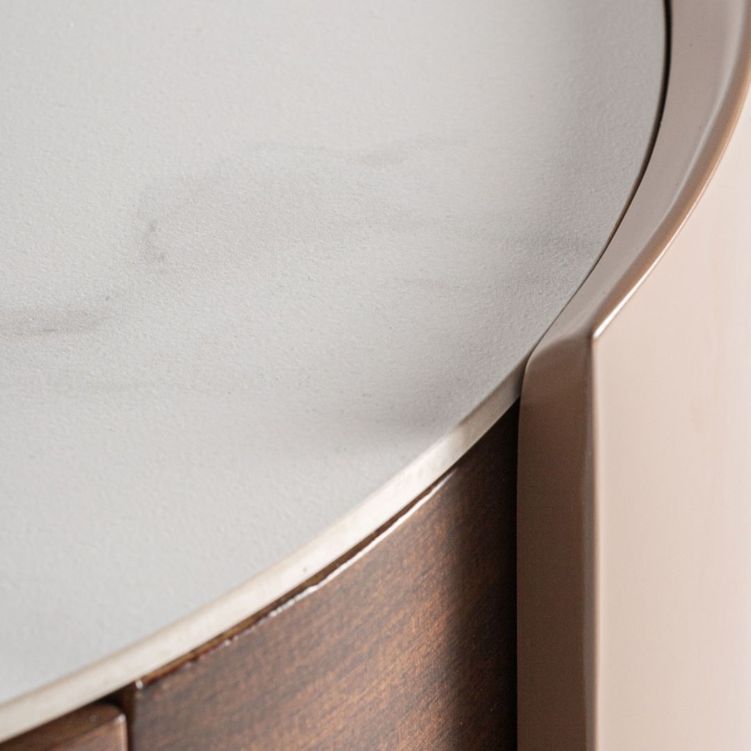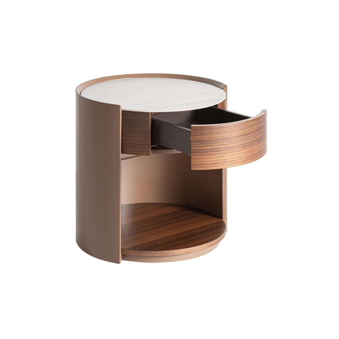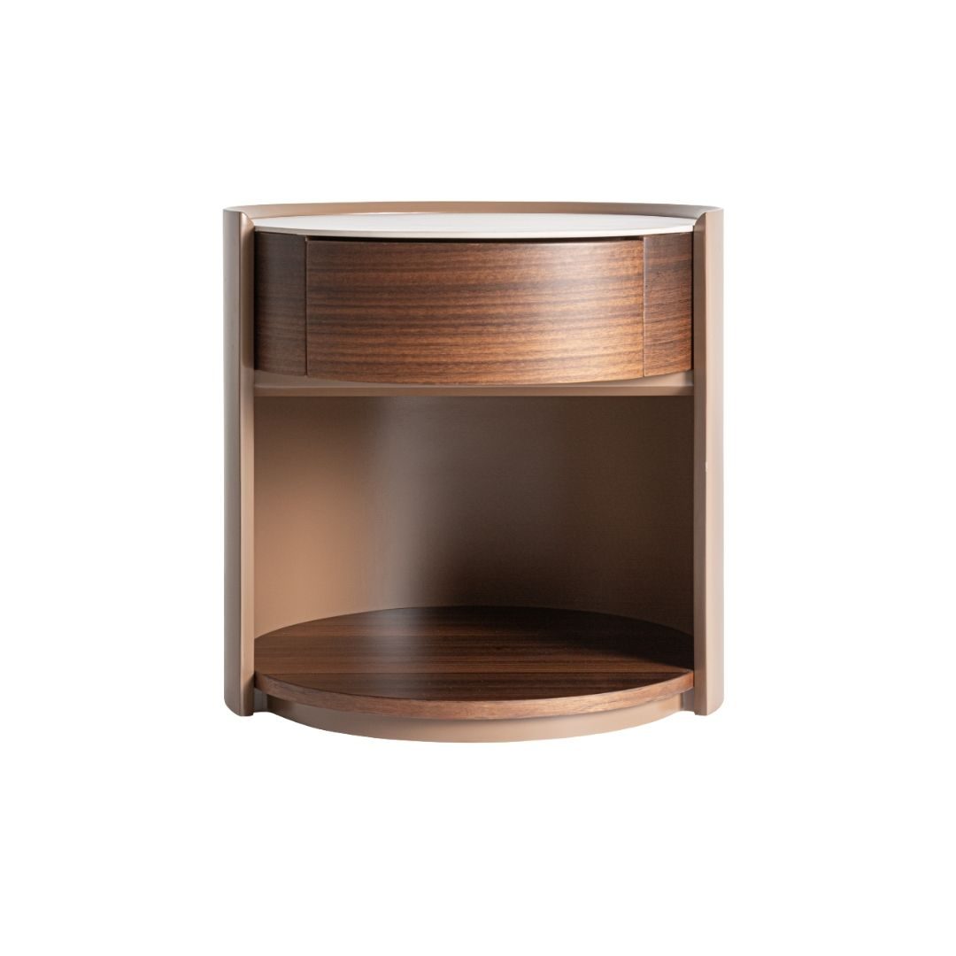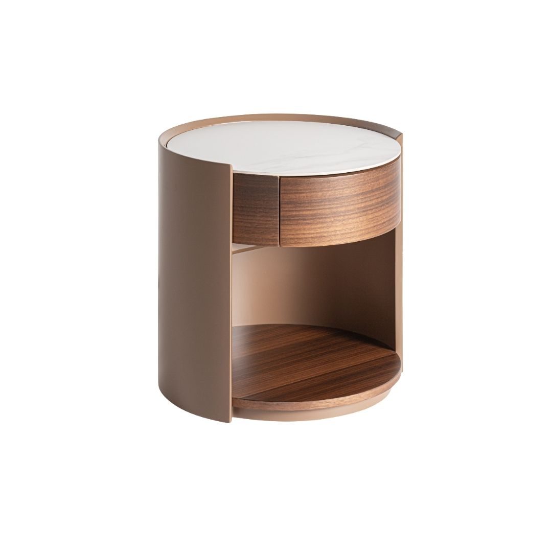 A mesa de cabeceira Giswil da Vical é o equilíbrio perfeito entre materiais naturais e design moderno. A estrutura robusta em madeira compensada castanha é suavizada pelo folheado de eucalipto em tom claro, enquanto o tampo em pedra sintetizada branca oferece um acabamento durável e requintado.